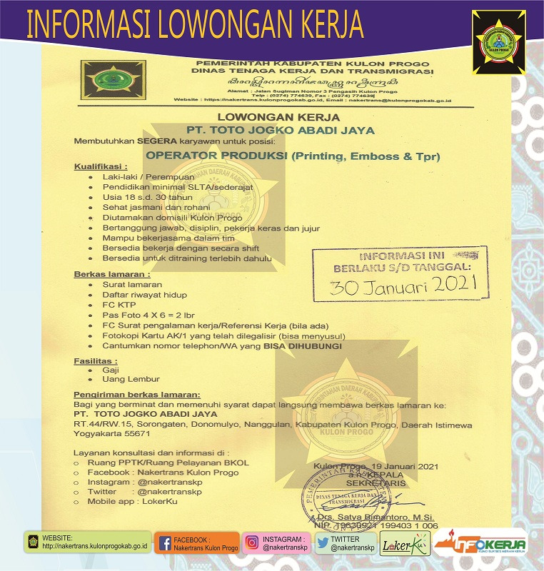 8 * bientôt disponible info loker jogja merupakan info lowongan kerja jogja atau daerah istimewa yogyakarta. Info loker las kulonprogo : Kulon progo tidak dipungut biaya (gratis) call center cpns kabupaten kulon progo 08133 573 7788. Beragam loker kulon progo untuk lulusan sma / smk, d3, dan s1 info terbaru dari kabupaten ini adalah mulai beroperasinya bandar udara internasional yogyakarta yang bisa kita sebut dengan. Profesional, berpengalaman dan mampu mencapai target perusahaan serta menaikan omset penjualan.